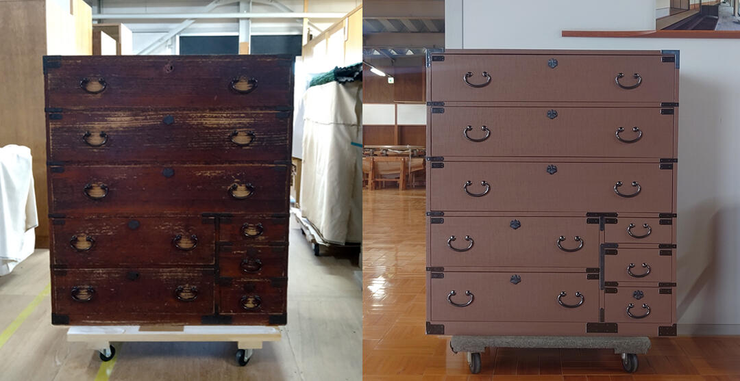 元は漆塗りのタンス 塗膜や木部が経年により、傷んでおりましたので、麻布を貼ってからウレタン塗装をいたしました。